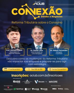 A Associação Empresarial de Uberlândia - Aciub realiza, no dia 17 de novembro, o Conexão: Direito & Negócios, que nesta edição traz como tema “Reforma Tributária sobre Consumo”. O encontro tem como objetivo aproximar o conhecimento jurídico e empresarial, oferecendo aos participantes uma visão prática e estratégica sobre as mudanças que irão transformar o ambiente tributário e os negócios no Brasil.